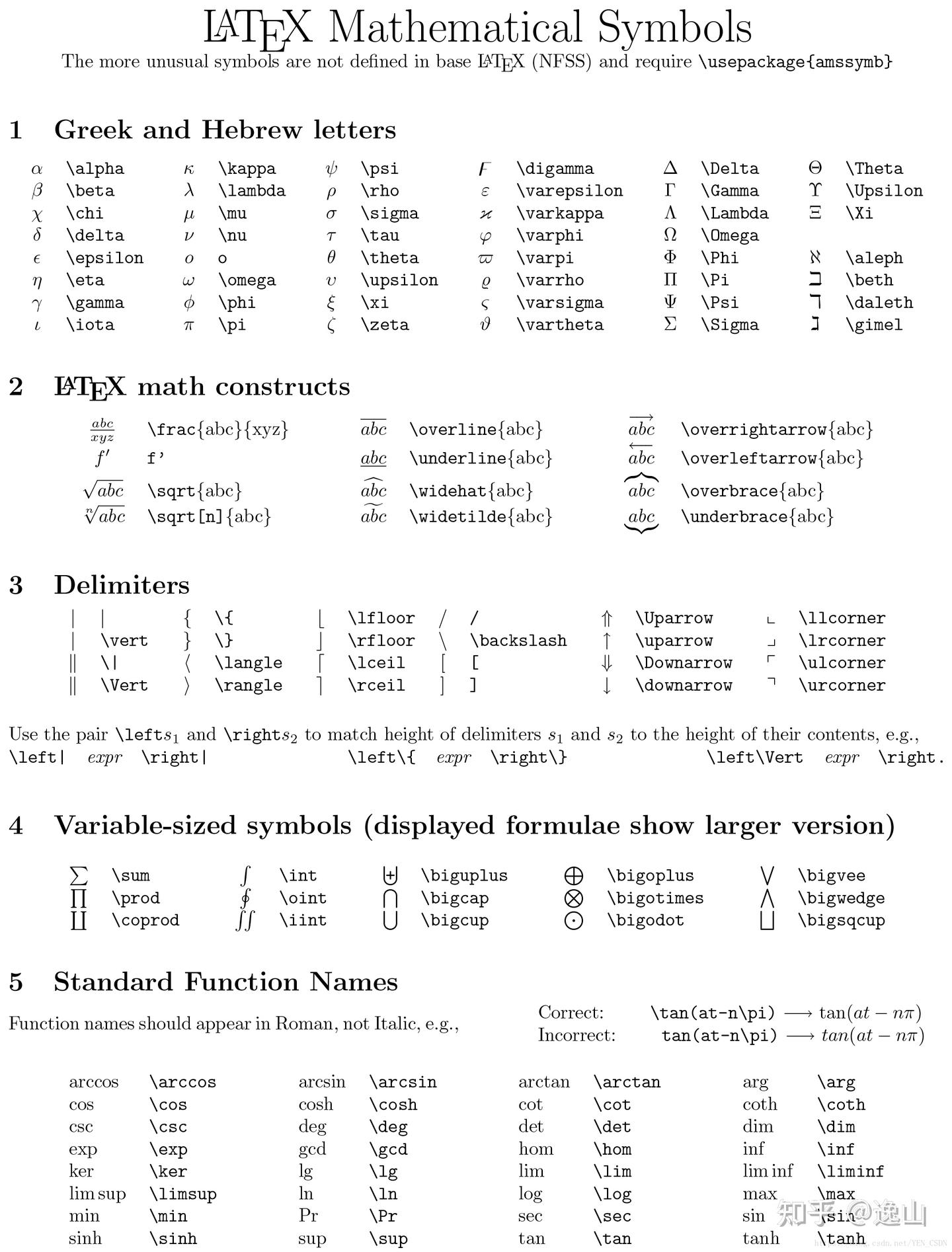 | 求和 | \Sigma 或\sum | $\Sigma$ 或$\sum$ | 建议用\sum。另外latex符号是区分大小写的(因为希腊字母是有大小写的),\sigma就是$\sigma$ |