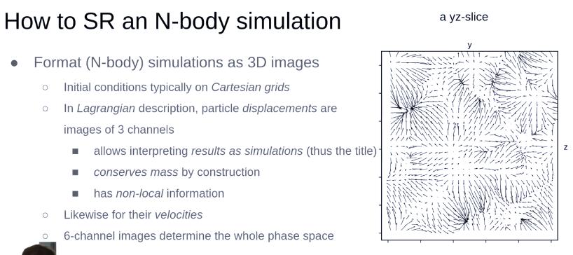 超分辨率是一个映射,而我们需要的映射不是个一对一的映射,需要它是一个一对多的映射。因为我们的高分辨率模拟中它的初始条件包含了低分辨率模拟中不存在的一些信息。这些高频的信息其实是随机的,而它有无穷多种可能性,所以这种映射其实是从一到无穷多的一个映射。