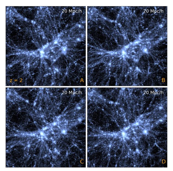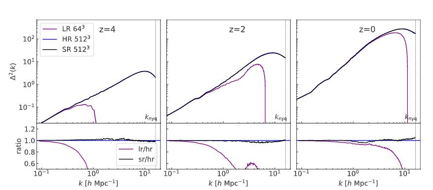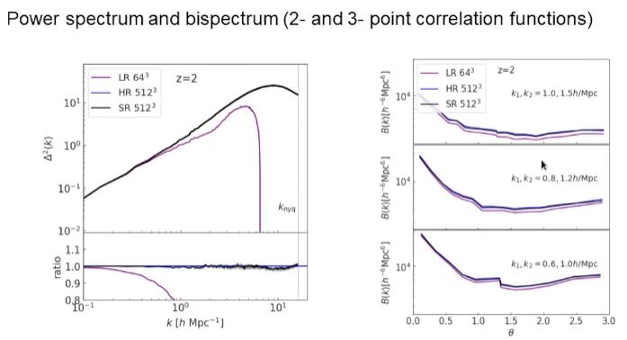 功率谱其实是傅里叶空间的两点关联函数,它刻画了不同尺度上物质的密度分布的一个涨落大小。我们可以看到在小尺度上面,超分别率和高分别率混合得非常好。