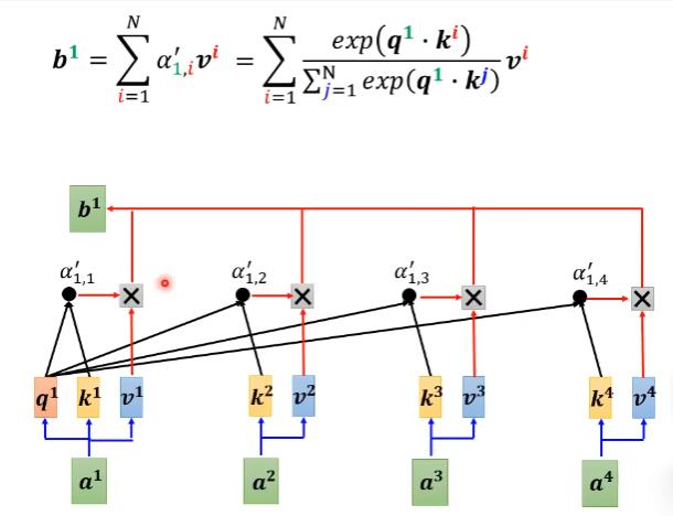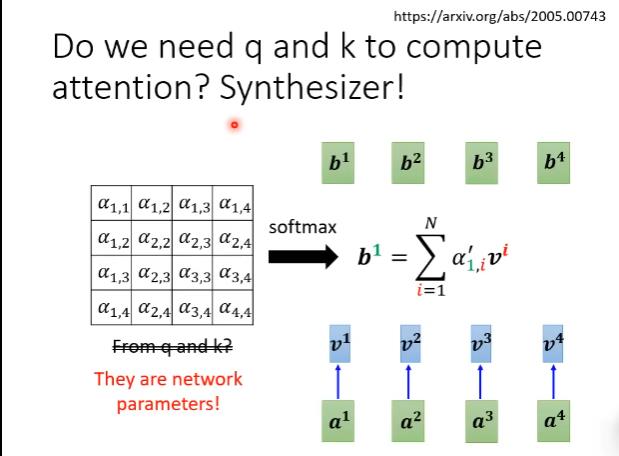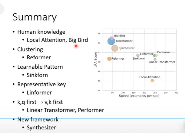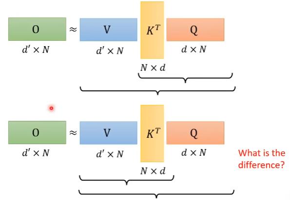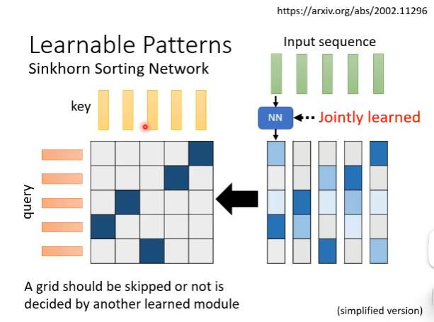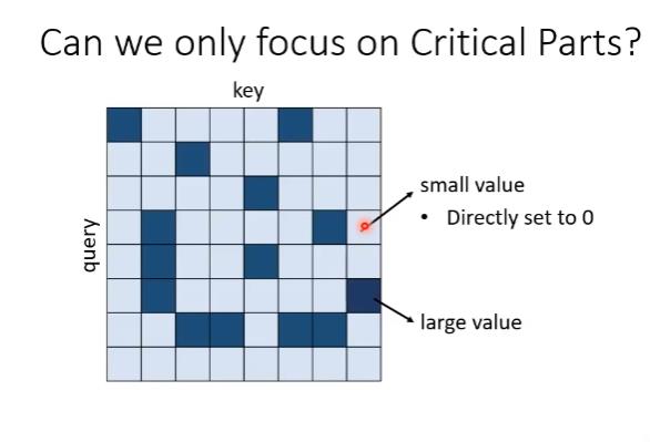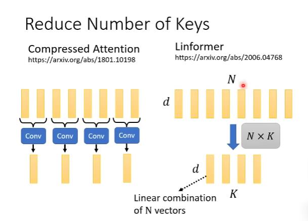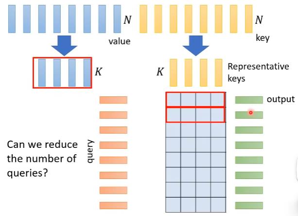 挑出K个有代表性的key(黄色vectors),然后计算出N×K的matrix,然后再挑出K给有代表性的value(蓝色vectors)。然后把K个key(黄色vectors)对第一个query算出来的attention weight(红色框)对这个K个value(蓝色vectors)做weighted sum得到self-attention的output(绿色vector)。