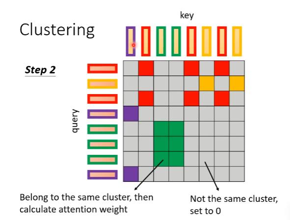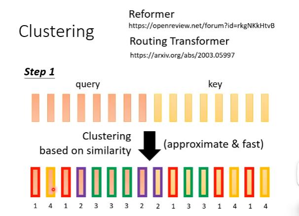 聚类的计算可以用近似(approximate)但快速(fast)的方式,从而加快计算。Reformer和routing transformer就采用了不同的clustering方式来加速计算。