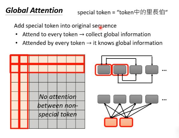 以上都是以某个位置为中心看左右的事情,如果我们关心整个sequence,那么我们可以用global attention。我们可以加入一个特殊token到原始的sequence里面。在这里,global attention会做两件事情: