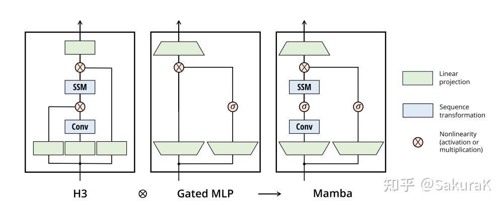 RetNet: 在架构中增加了一个额外的门,并使用更简单的 SSM,允许另一种可并行计算的路径,使用多头注意力(MHA)的变体来代替卷积。