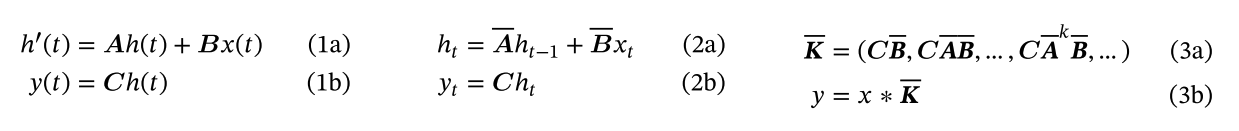 在参数从 (∆,A,B,C) ↦ (A,B,C) 转化之后,模型可以通过两种方式计算,一种是线性递归 (式2) (使用RNN),另一种是全局卷积 (3) (使用CNN)。