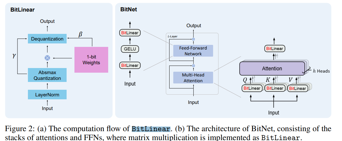 BitNet是之前的工作,《Scaling 1-bit Transformers for Large Language Models》,每个参数都是二元并取值为 {-1, 1}.