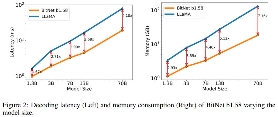 该研究进一步将模型大小扩展到 7B、13B 和 70B 并评估成本。图 2 显示了延迟和内存的趋势,随着模型大小的增加,增长速度(speed-up)也在增加。特别是,BitNet b1.58 70B 比 LLaMA LLM 基线快 4.1 倍。这是因为 nn.Linear 的时间成本随着模型大小的增加而增加,内存消耗同样遵循类似的趋势。延迟和内存都是用 2 位核测量的,因此仍有优化空间以进一步降低成本。