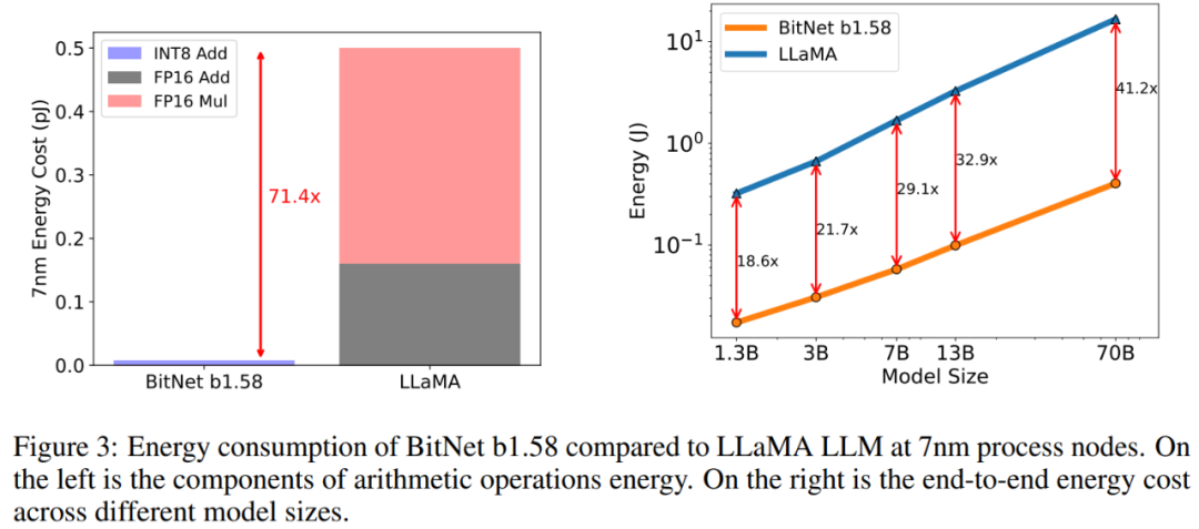 该研究还对 BitNet b1.58 和 LLaMA LLM 的算术运算能耗进行了评估,主要关注矩阵乘法。图 3 说明了能耗成本的构成。BitNet b1.58 的大部分是 INT8 加法计算,而 LLaMA LLM 则由 FP16 加法和 FP16 乘法组成。根据 [Hor14,ZZL22] 中的能量模型,BitNet b1.58 在 7nm 芯片上的矩阵乘法运算能耗节省了 71.4 倍。