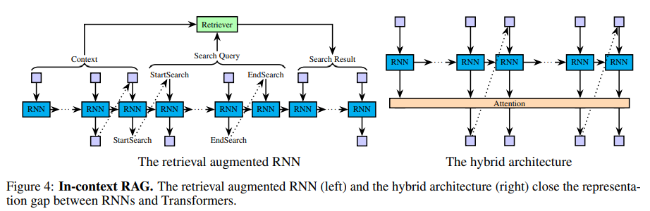 首先,我们探索 RNN 与检索增强生成 (RAG) 的强大功能,它使 LM 能够检索相关信息以协助生成。在我们的上下文中,我们特别感兴趣的是允许 LM 调用函数从其上下文中检索信息,我们将其称为In-context Retrieval Augmented Generation (In-context RAG).