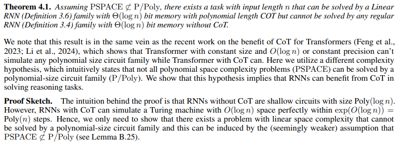 然而,上述结果并不排除通过额外的提示技术或微小的架构改变来增强 RNN 可能缩小与 Transformer 差距的可能性。事实上,Transformer 本身也不完美,可能需要在推理时使用额外的技术才能在某些任务上表现良好。作为一个著名的例子, 思想链 (CoT) 是一种提示技术,要求模型在给出最终答案之前生成一系列中间标记,众所周知,它对于 Transformers 在需要数学或算法推理的任务上表现良好至关重要。部分研究者从表示能力的角度解释了这一点:变压器本身没有足够的表示能力来解决超出特定电路复杂性类别的问题($TC^0$),但通过 CoT,他们甚至可以模拟任何多项式时间图灵机。