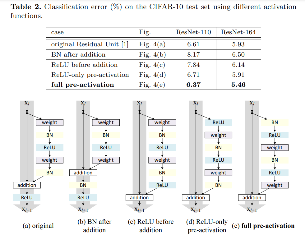 下图是不同顺序的残差块结构和实验结果,指标是分类错误率: