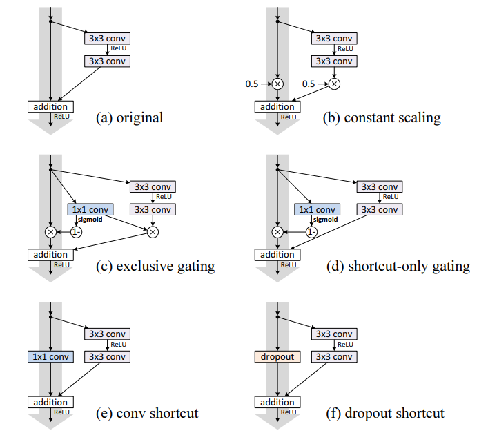 图(c) vs 图(a):(c)将identity mapping分支的ReLU激活函数前移在了residual分支中,因此residual分支的输出永远是大于等于0的,这意味着模型在前向传播的过程中,数值只会单调递增,这无疑会影响模型的表征能力. 这也是为什么,这个结构的结果比baseline更差. 【residual分支其输出应该要保证在(-∞, +∞)】