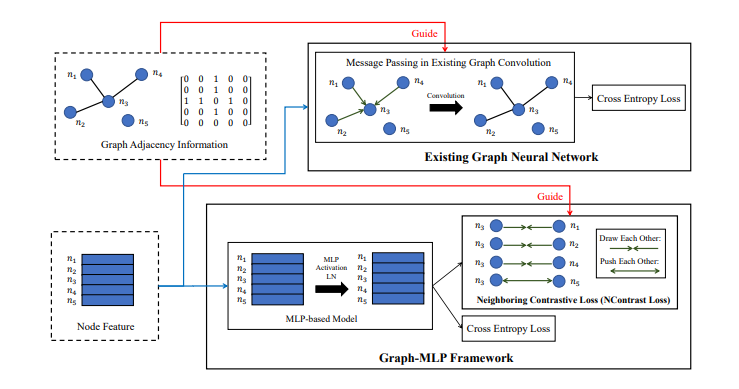 最近的图神经网络(GNN)都依赖于邻接矩阵来指导特征聚合过程中邻居之间的消息传递,研究工作主要集中在强大的消息传递模块上。然而本文表明没有任何消息传递模块也是可行的。相反地,本文通过设计了一个邻近对比(NContrast)损失,通过隐式利用邻接信息来弥合 GNN 和 MLP 之间的差距。