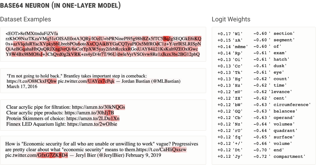 1 层 SoLU 模型中的神经元似乎对 Base64 编码的文本进行触发(左)。神经元对 logits 的扩展权重(右)增加了混合情况下很少出现在单词中的一堆标记的概率,同时降低了代表英语单词的多个标记的概率,这一事实证实了这一点。可以将其理解为一个可解释的规则,即在 Base64 文本上,下一个标记更有可能也是 Base64。