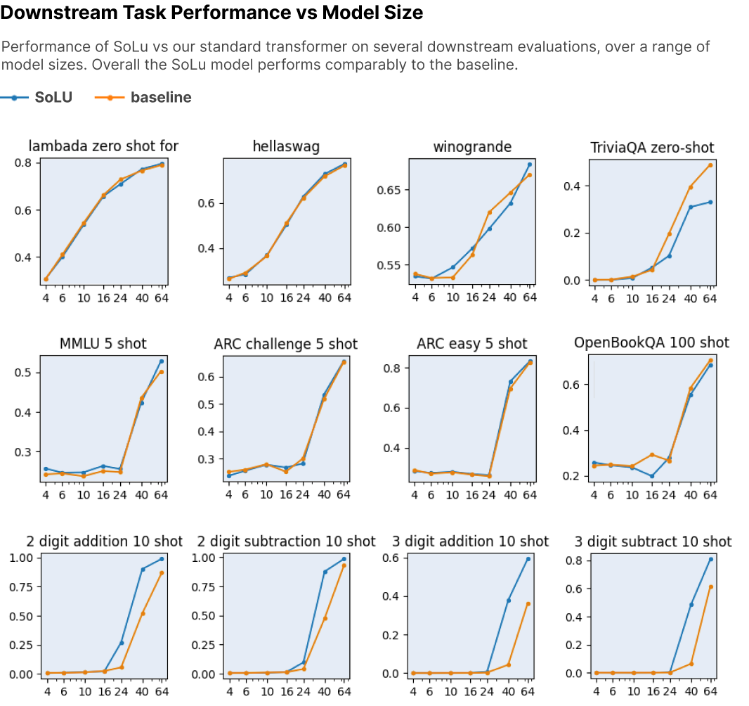 上图为下游任务的性能。由于SoLU 使用基线的一系列超参数,并且 SoLU 的最佳超参数可能与基线模型的最佳超参数不同。但表明 SoLU 至少与基线一样好。