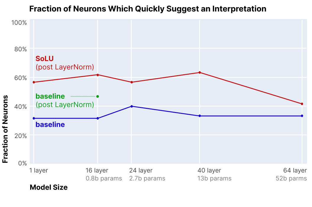 蓝线显示了标记为初步表明基线变换器中模型大小范围从 1 到 64 层的解释的神经元分数。 红线显示了标记为初步暗示 SoLU 转换器中的解释的神经元部分。 绿点显示了标记为初步表明 16 层模型中带有额外层范数但不带有 SoLU 的解释的神经元的分数。 总体而言,在 1 层到 40 层的模型中,SoLU 将可解释神经元的比例增加了约 25%,而在 64 层模型中,增益要小得多。
