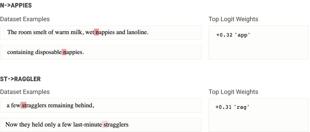 后期层神经元(靠近网络输出的神经元)通常会做与早期层神经元相反的事情:它们介导单词或上下文标记返回文字标记的转换。例如,最后一层中的一个神经元会触发标记“st”,同时增加后续标记是“rag”的可能性;本质上,这是一种将单词“stragglers”的表示形式逐个转换或指示为其组成标记以进行输出的方法。类似地,“nappies”输出神经元在标记“n”上触发,并增加标记“app”帮助写入“nappies”的概率。这些神经元本质上模拟了一个额外的输出词汇项,该词汇项仅在前面的标记满足某些条件时才可用。