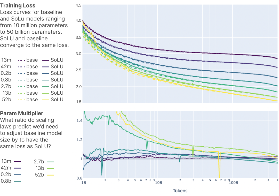 如图所示,SoLU 大致相当于所有模型大小的基线,始终落在模型大小的 1.05 倍和 0.95 倍乘数之间(与大多数情况下相比,大致相当于 ±0.01 纳特的损失变化)总共损失 1.6-3 纳特)。 尽管所有差异都很小并且更有可能是随机噪声(在 50B 模型上,SoLU 相当于将模型大小增加 1.01 倍),但在大模型尺寸下,SoLU 的性能可能会比基线稍好一些。 )。