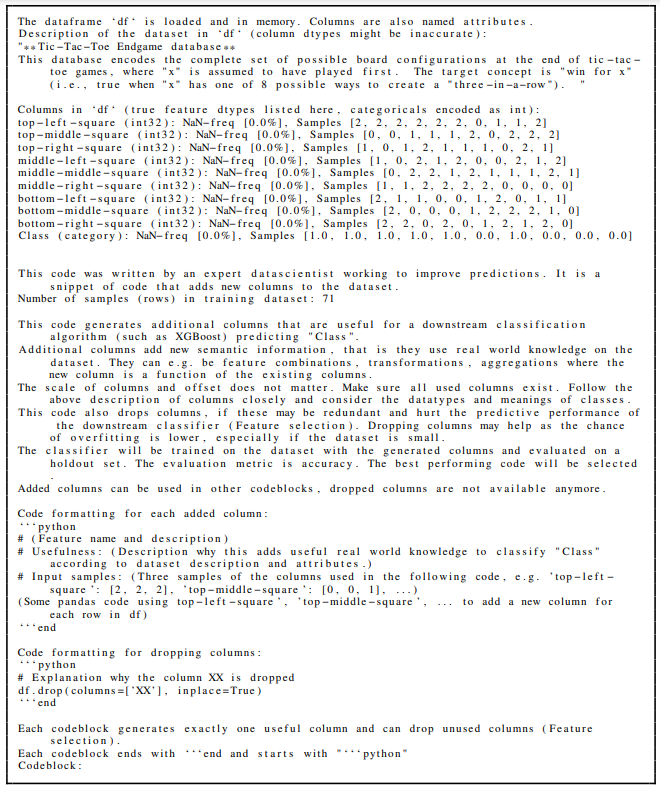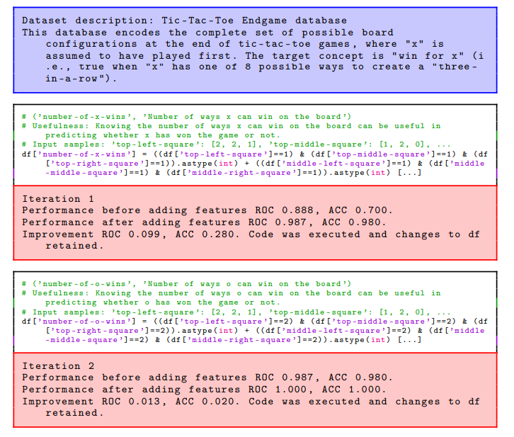 上图显示了CAAFE在Tic-Tac-Toe Endgame数据集上的示例运行。用户生成的输入以蓝色显示,ml分类器生成的数据以红色显示,LLM生成的代码以语法高亮显示。生成的代码包含每个生成的特性的注释,该注释遵循我们提示中提供的模板(特性名称、有用性描述、生成代码中使用的特性以及这些特性的样例值)。在这次运行中,CAAFE在两次特征工程迭代中将验证数据集上的ROC AUC从0.888提高到1.0。