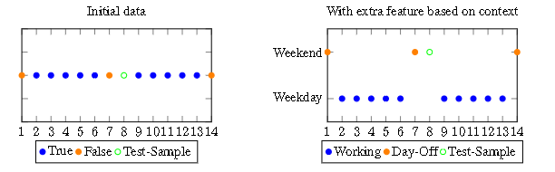 上下文信息可以极大地简化任务。在左侧,图中没有添加任何上下文信息,并且很难预测绿色查询点的标签。在右侧添加了上下文信息,并派生出有用的附加特征(周末或工作日),从中可以找到从特征到目标的映射。