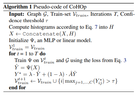 在每次迭代之前,我们将模型以高置信度进行预测的节点以及现有的地面实况训练节点添加到训练集中。我们将模型预测作为这些非真实节点的标签,并将它们称为伪标签。