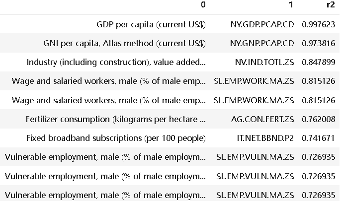 由上,我顺带分析了所有的514个世界银行特殊指标,其中GDP具有最高的R2,这也说明GDP已经足够了。