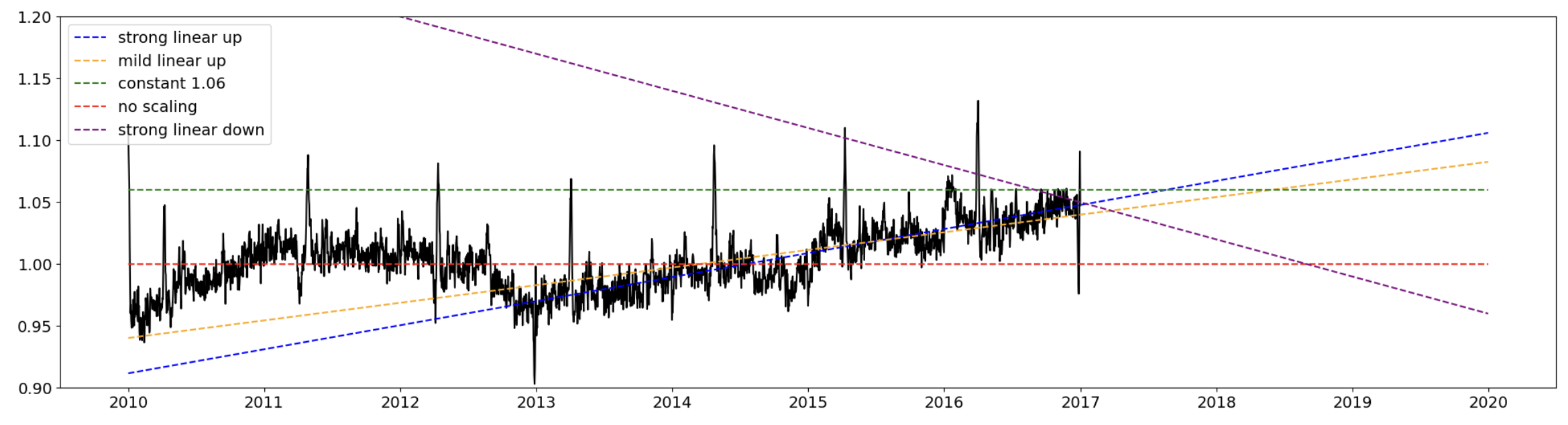 所以Chris采用了两种策略,第一种是全乘以1.06,第二种是乘上1.06 + slope * (year - 2017)。