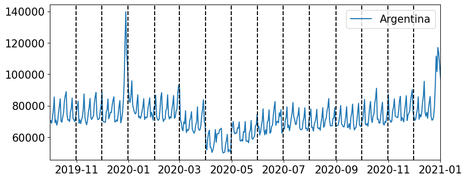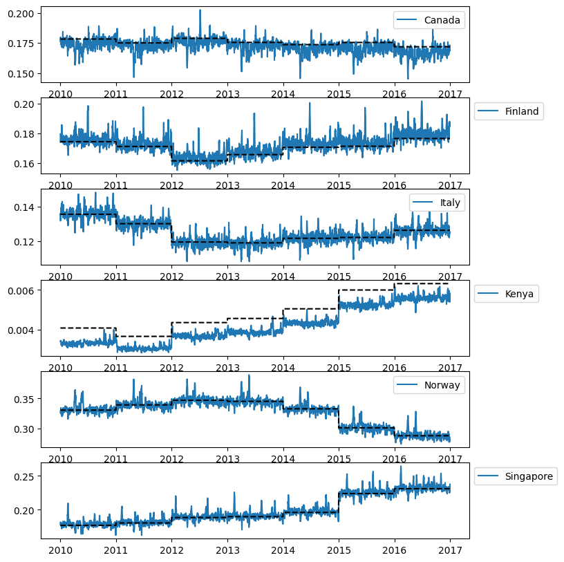 观察到数据后,发现加拿大和爱沙尼亚在12月26日和27日有节假日。模型已经单独处理了“大”的新年假期,为避免多重共线性,打算从普通节假日列表中移除1月1日和12月25日。