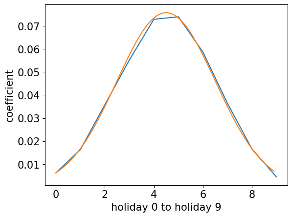 holiday_diff = [np.exp(-(i - 4.5) ** 2 / 8.5) for i in range(11)]:- 创建一个单一的