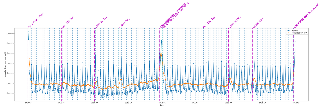 作者检查直线,发现:下面的代码从时间序列数据中识别潜在的候选国家特定假日。通过计算残差并根据国家和一年中的日期进行分组,它使用 z 分数检测显著偏差。这些偏差可能表明假日或特殊事件会影响销售模式