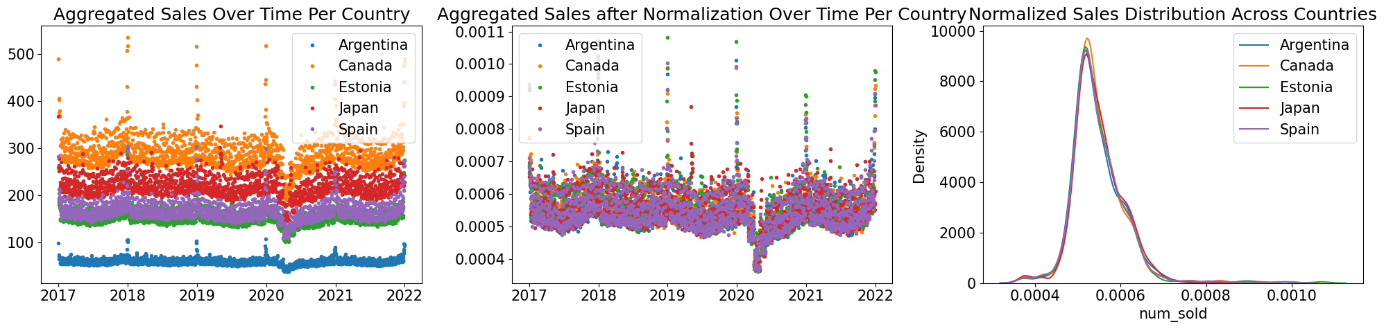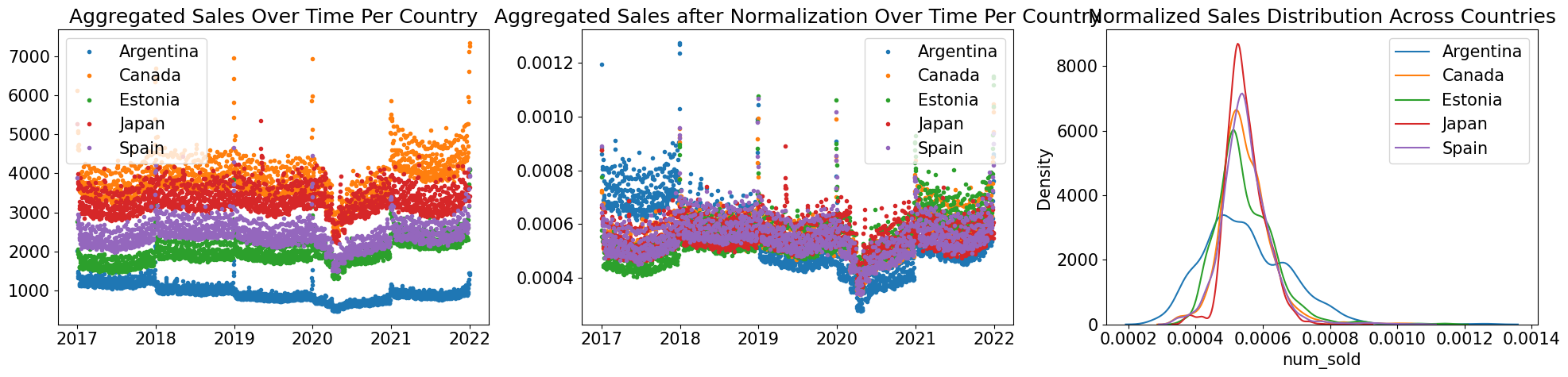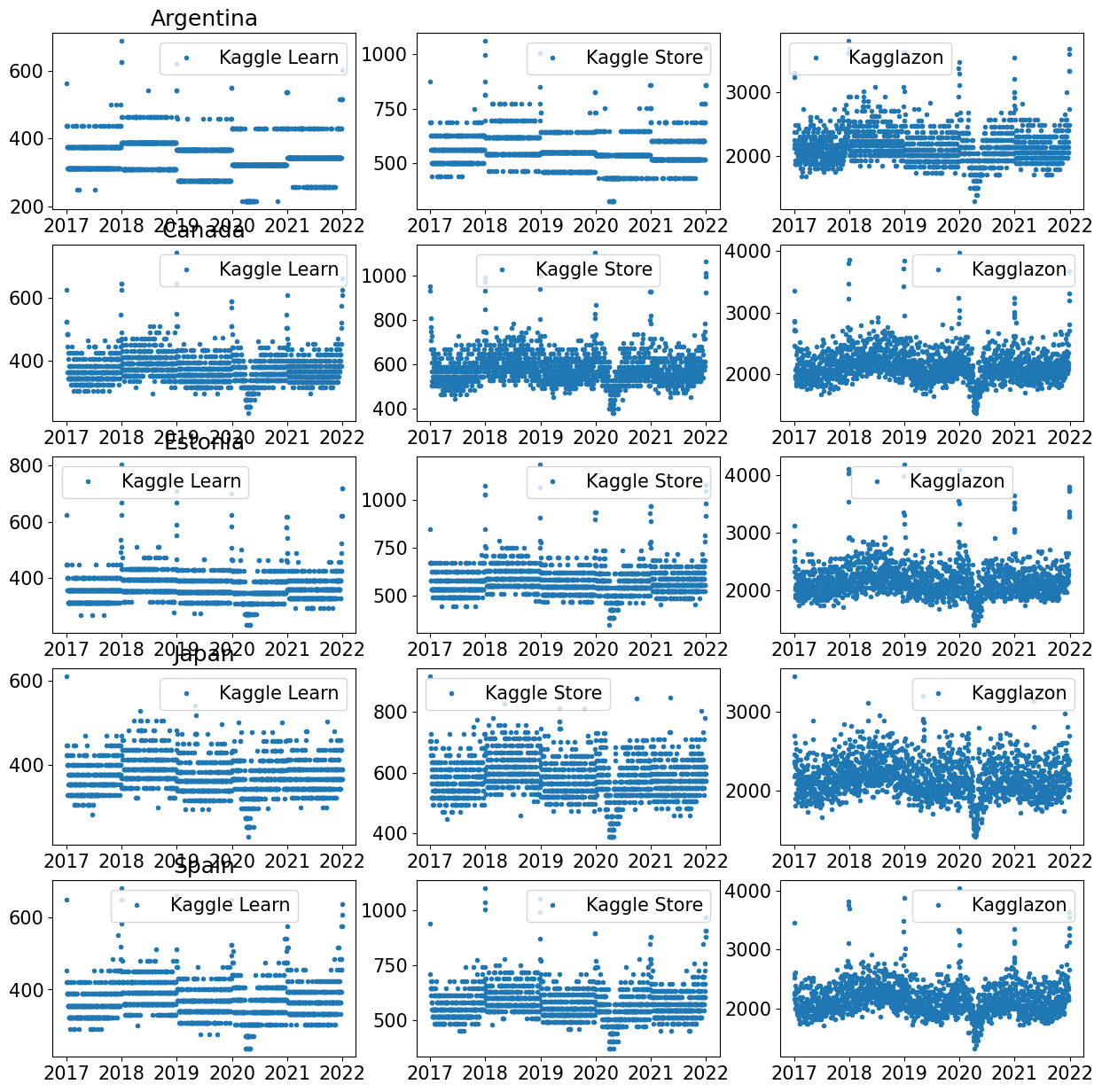 继续分析数据,作者观察到 Kagglazon 的”num_sold”呈现出良好的正弦波。然而,对于阿根廷和爱沙尼亚这两个国家,Kaggle Learn 和 Kaggle Store 的”num_sold”则表现为直线。