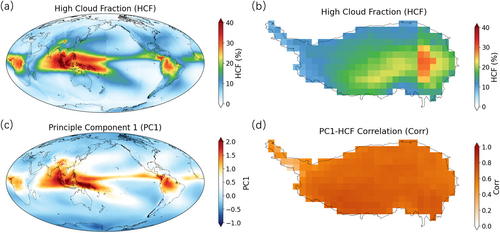 PC1 与高云量之间的关系。(a) 从 CERES 数据中提取的 2010-2020 年间的全球高云量。(b) 青藏高原上高云量的分布。(c) 从 ERA5 再分析数据中提取的同一时期气象条件的主模态。(d) 在青藏高原上,气象条件主模态与高云量之间的相关系数分布,所有网格点都通过了 99% 的显著性检验,因此我们整个空间部分的相关系数是显著的。