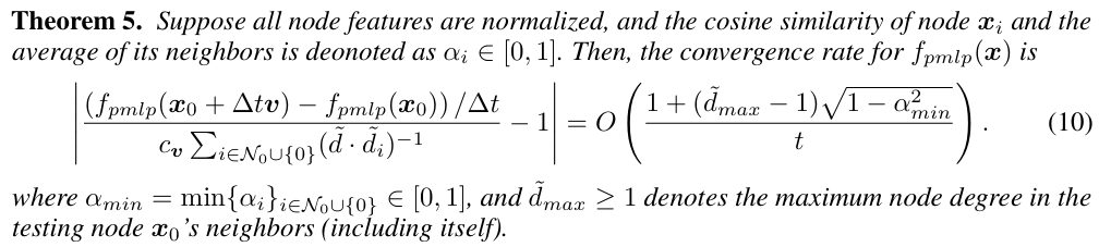 作者回答:确实,定理 4 和 5 的目的是为了揭示“图神经网络天生具有泛化能力”的理论洞察,并解释我们关于 GNNs/PMLPs 具有优越泛化能力的实证发现,这种泛化能力源于用于推理的 GNN 架构本身,而不是严格回答“为什么用 MLP 权重替换 GNN 权重不会损害准确性”。PMLPs 和 GNNs 之间接近的性能实际上作为实证证据,使得我们的理论结果更加有力:如果权重对泛化很重要,那么在分析中“不考虑权重看起来如何”时,我们的理论结果将不那么有说服力。