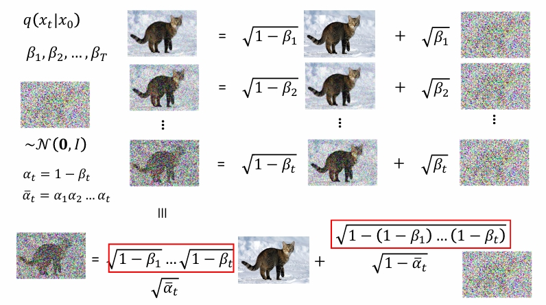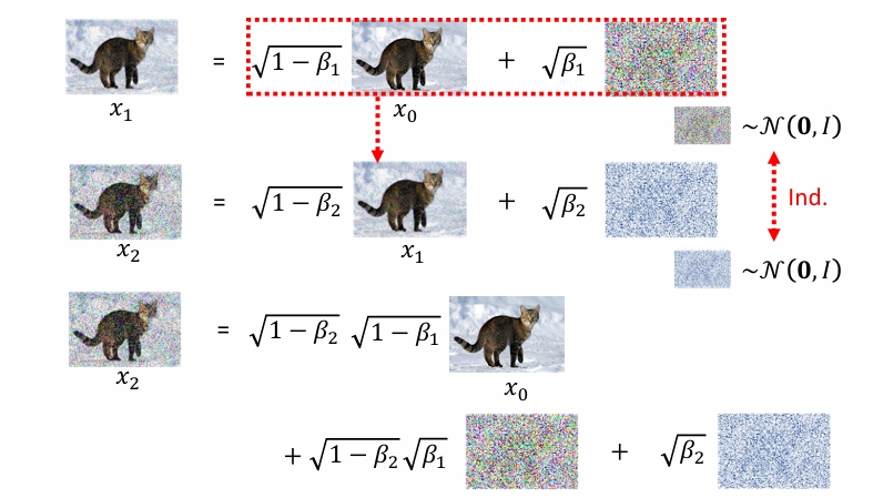 这种原理其实很显然,比如像GAN和VAE,从特定分布中抽取并生成,image = f(noise)。Diffusion也是这样,只要我们能通过一个g(image)=noise,那么我们就能从g(image)=noise中得到image = f(noise)。但由于神经网络的复杂性(一个黑盒子很难找到它的反函数),所以Diffusion做的处理是,加噪使用简单的操作,去噪再使用神经网络,而不是两者都用神经网络。(这样做也更简单。)