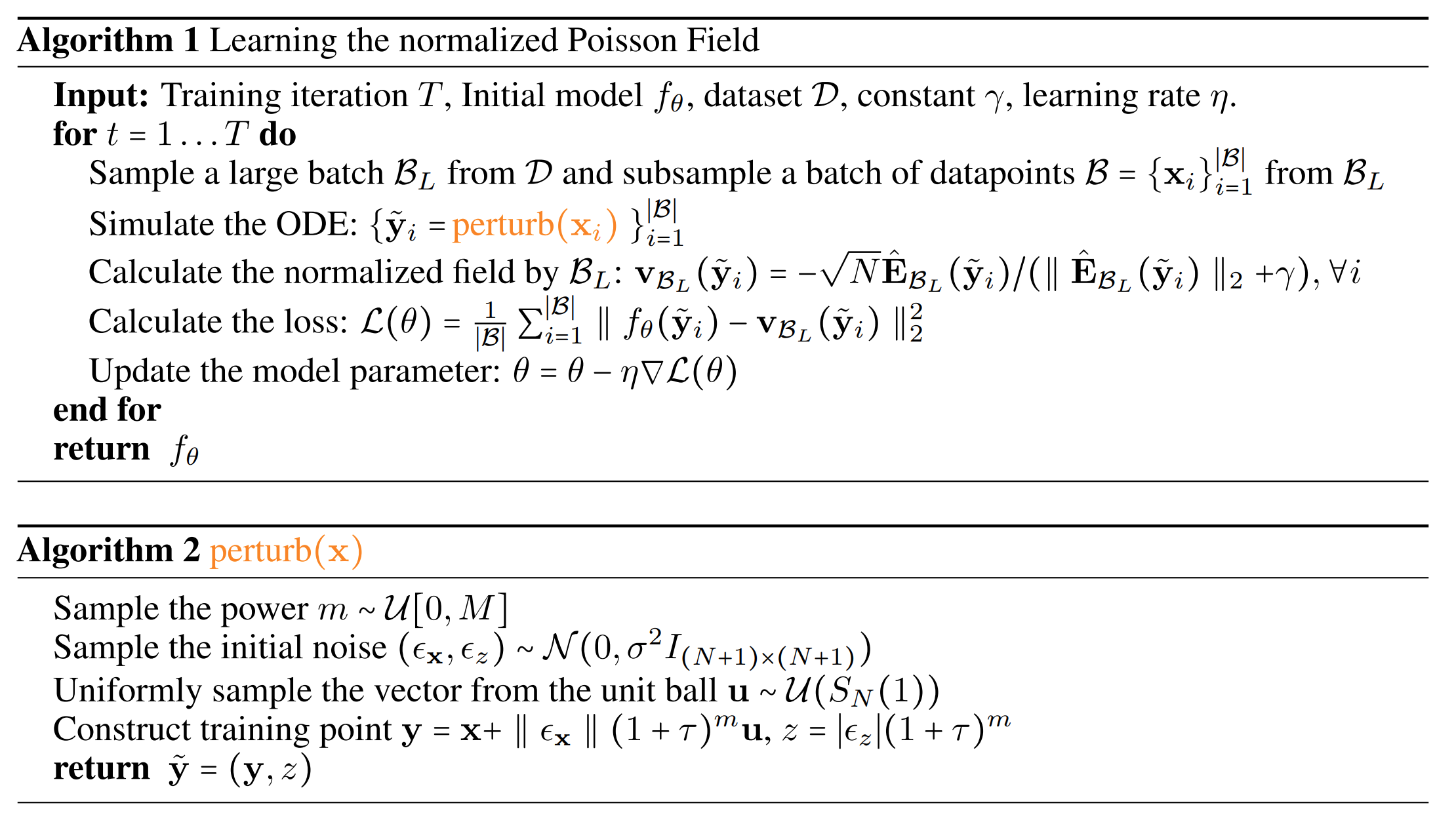 如果我们知道由分布产生的电场(即泊松场),那么我们可以从半球上均匀采样的点开始,在反向时间中运行动力学(沿着电场线运动),以恢复原始数据分布。