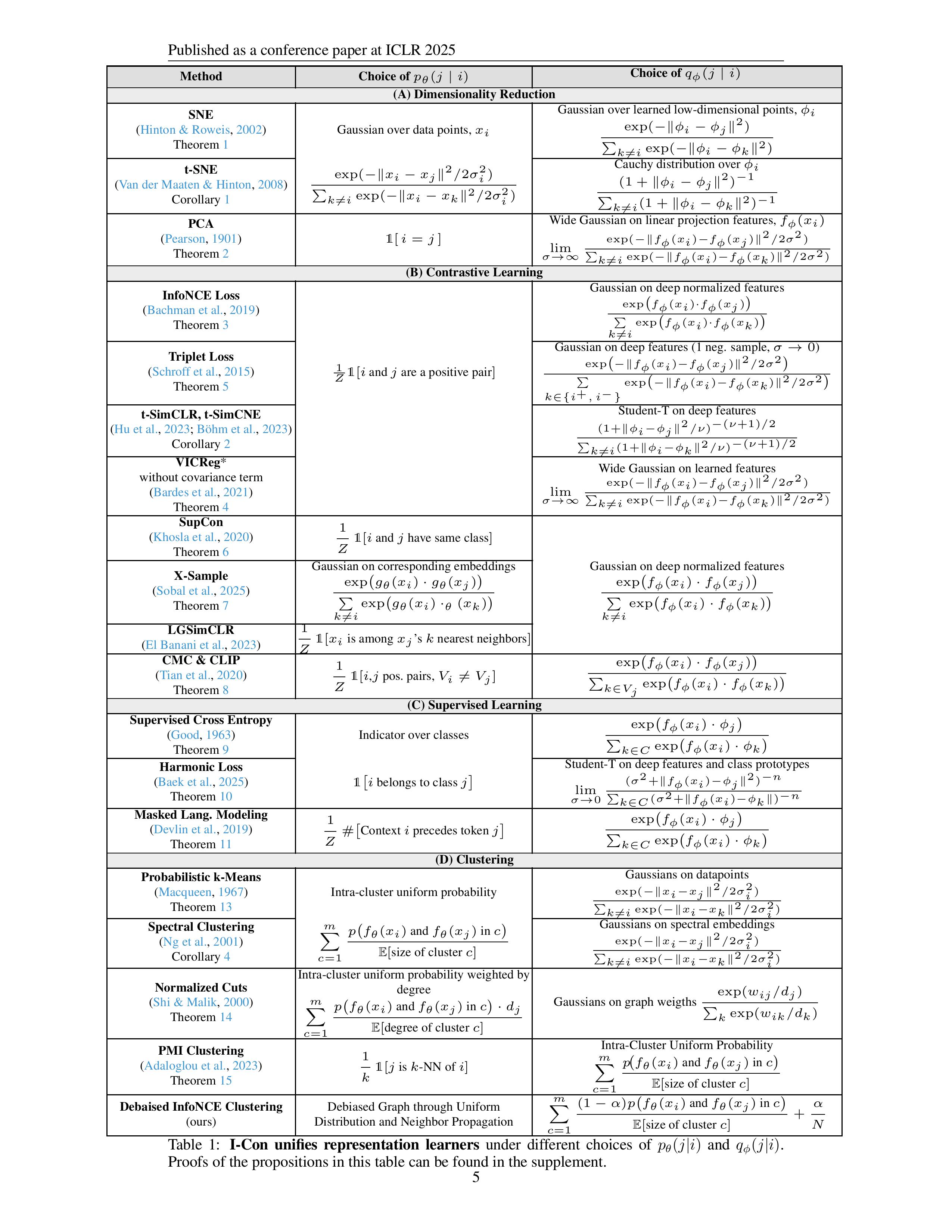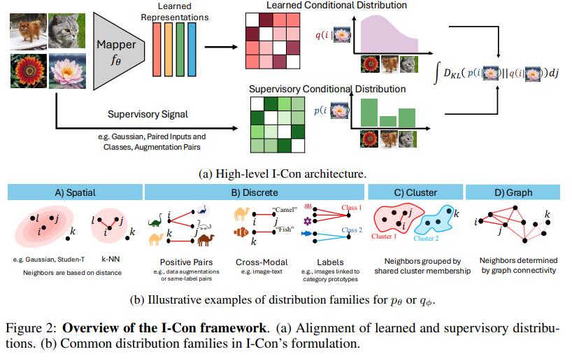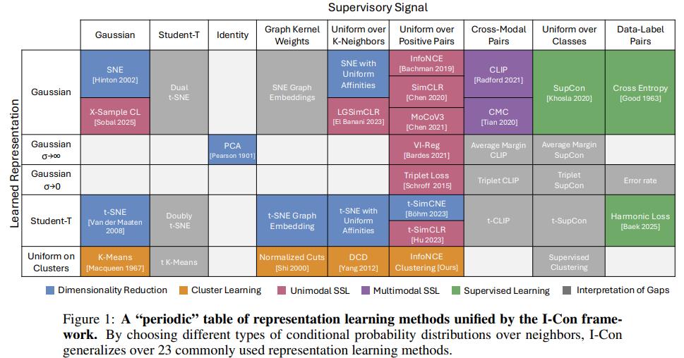 I-Con (I-Con: A Unifying Framework for Representation Learning ,ICLR 2025)是第一个将监督学习、对比学习、聚类和降维目标统一到一个损失函数下的框架,从kmeans、TSNE到SimCLR、CLIP都能统一到一起。