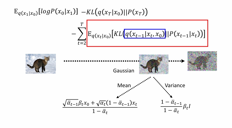 q(x _ {t-1}\mid x_t,x_0)&=N(\frac{\sqrt{\alpha _ {t-1}}\beta_tx_0+\sqrt{\alpha_t}(1-\bar\alpha _ {t-1})x_t}{1-\bar\alpha_t},\frac{1-\bar \alpha _ {t-1}}{1-\bar \alpha _ {t}}\beta_tI)
