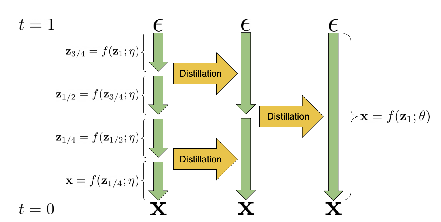 使用学生模型去学习如何用一步来模拟教师模型多步(通常是两步)的去噪效果。