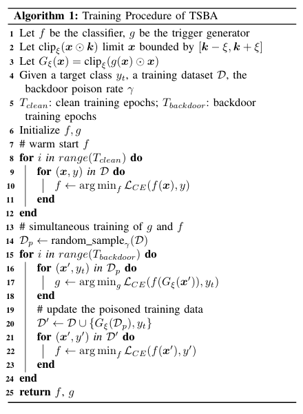 预训练完成后,我们同时训练触发器生成器 g 和部分训练的分类器 f 。
