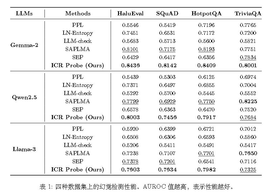 另一种方法是检查大语言模型各层中的隐状态(例如嵌入向量)以检测幻觉 。基于输出或 Logit 概率的方法通常需要真实值参考或多次生成以保证一致性。相比之下,基于隐状态的检测方法具有无需参考的优势,无需依赖外部资源。