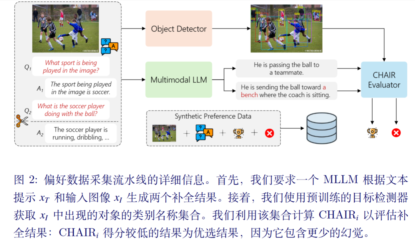 首先,对于数据集中的每个三元组,丢弃 y ,并从参考的指令微调多模态大模型$\pi_{ref}$中采样一组新的可能答案 {y1, y2} 。然后,我们将一个现成的检测器应用于图像$x_I$,该检测器经过训练以识别预定义的一组对象,将检测到的项目类别名称视为图像中实际存在的真实物体集合$x_I$。此时,可以计算生成答案的$CHAIR_i$得分,任何未出现在真实物体集合中的提及对象均被视为幻觉。