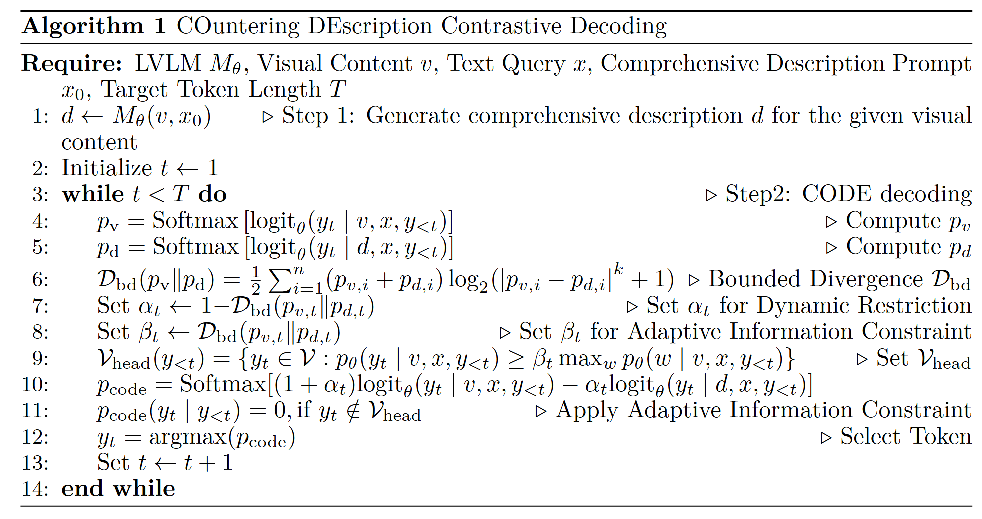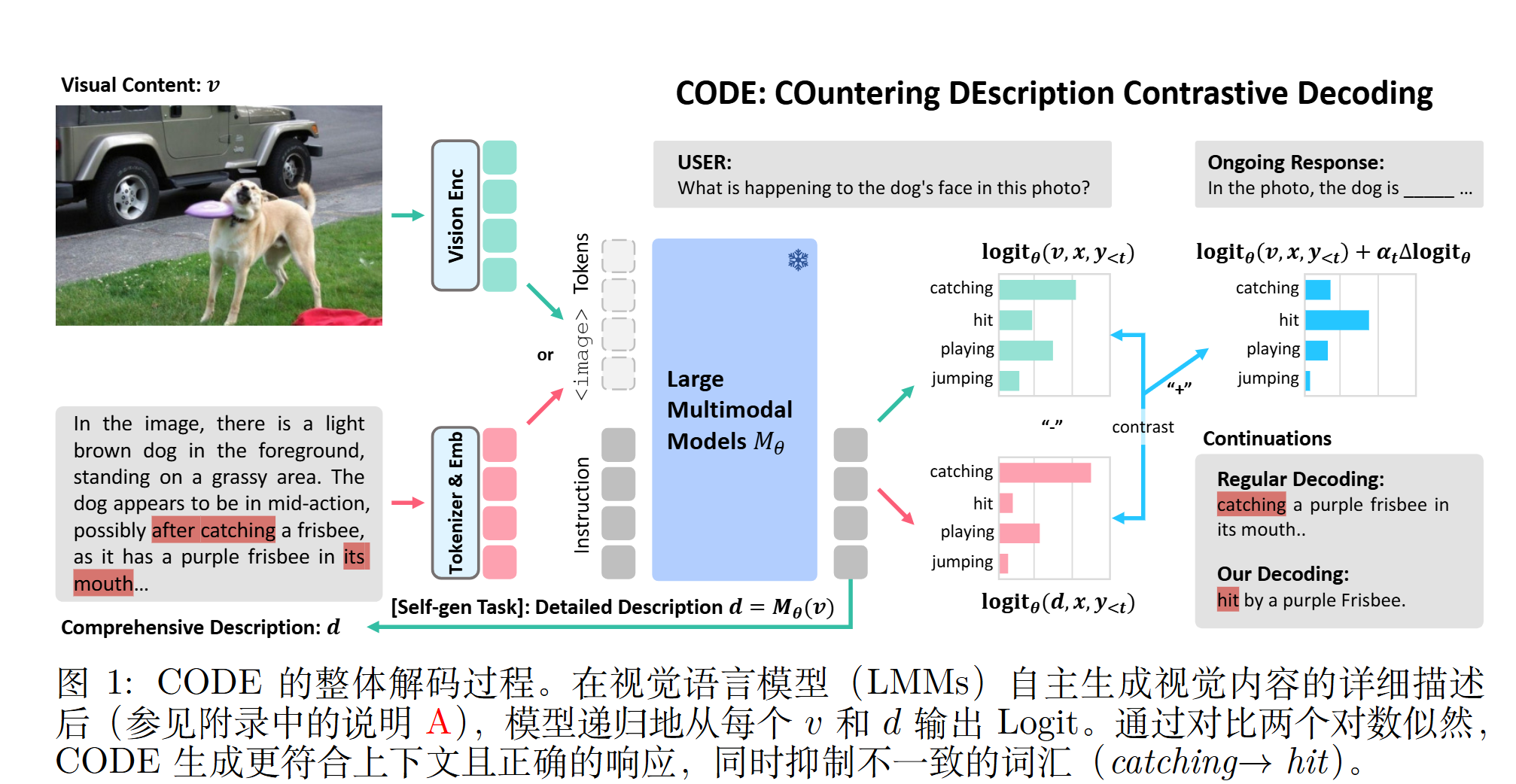 - CODE是一种无需训练的解码策略,利用自生成的描述来减少大型多模态模型中的幻觉现象。通过对比描述所包含的 Logit 信息与实际视觉内容,CODE 提升了模型响应的视觉一致性和连贯性。
