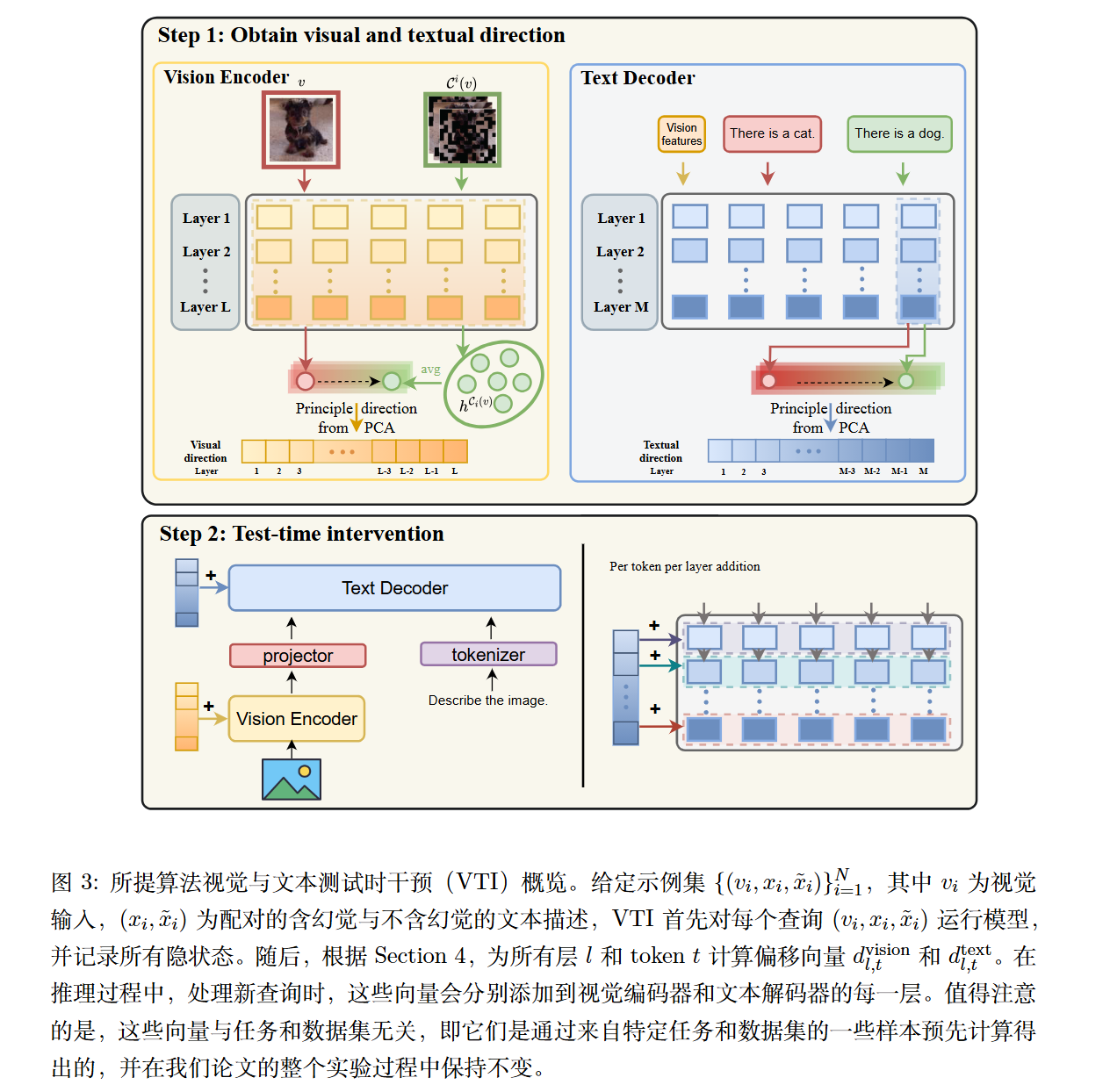 具体而言,预先计算了更稳定特征的“方向”,并在推理过程中一致地应用于所有查询示例以减少幻觉,而无需引入额外的训练或推理成本。由于有时幻觉源于文本解码器(即 LLM),进一步获取了文本方向并将其应用于文本解码器以最大化性能。