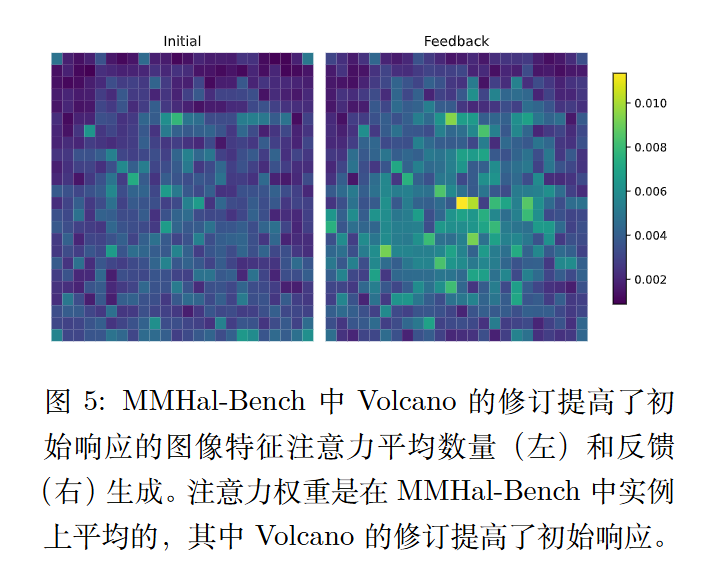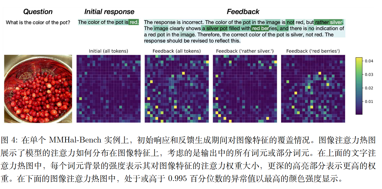 基于所有关注图像特征的词元的热力图,当 Volcano 生成初始响应时,它主要关注外边缘的特征,对应于锅的边缘;在生成反馈时,它关注整个图像,包括对应于银色锅的外部区域和包含红色浆果的内部区域。