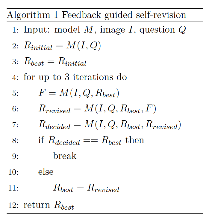 首先,类似于其他 LLM,它为图像 $R_{initial}$ 和问题 $I$ 生成初始响应 Q ,并将最佳响应 $R_{best}$ 初始化为 $R_{initial}$ 。此阶段在整个创建最终响应的过程中只执行一次。