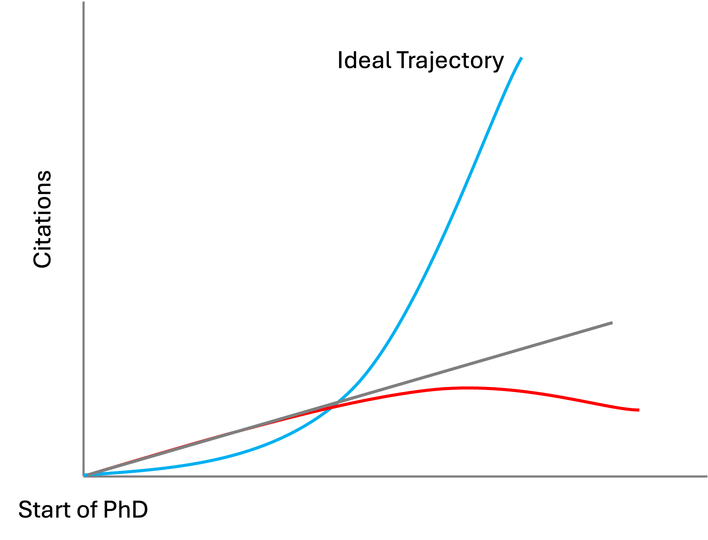 当我向导师询问进入市场的问题时,他们中的一些人立即打开了我的 Google 学术页面。他们没有看原始数字;他们正在寻找我的生产力和一种趋势——非正式的“曲棍球棒”(缓慢的开始,然后是陡峭的上升曲线)。这条曲线的轨迹远比任何单个数字都重要。是平坦的,还是开始攀升?