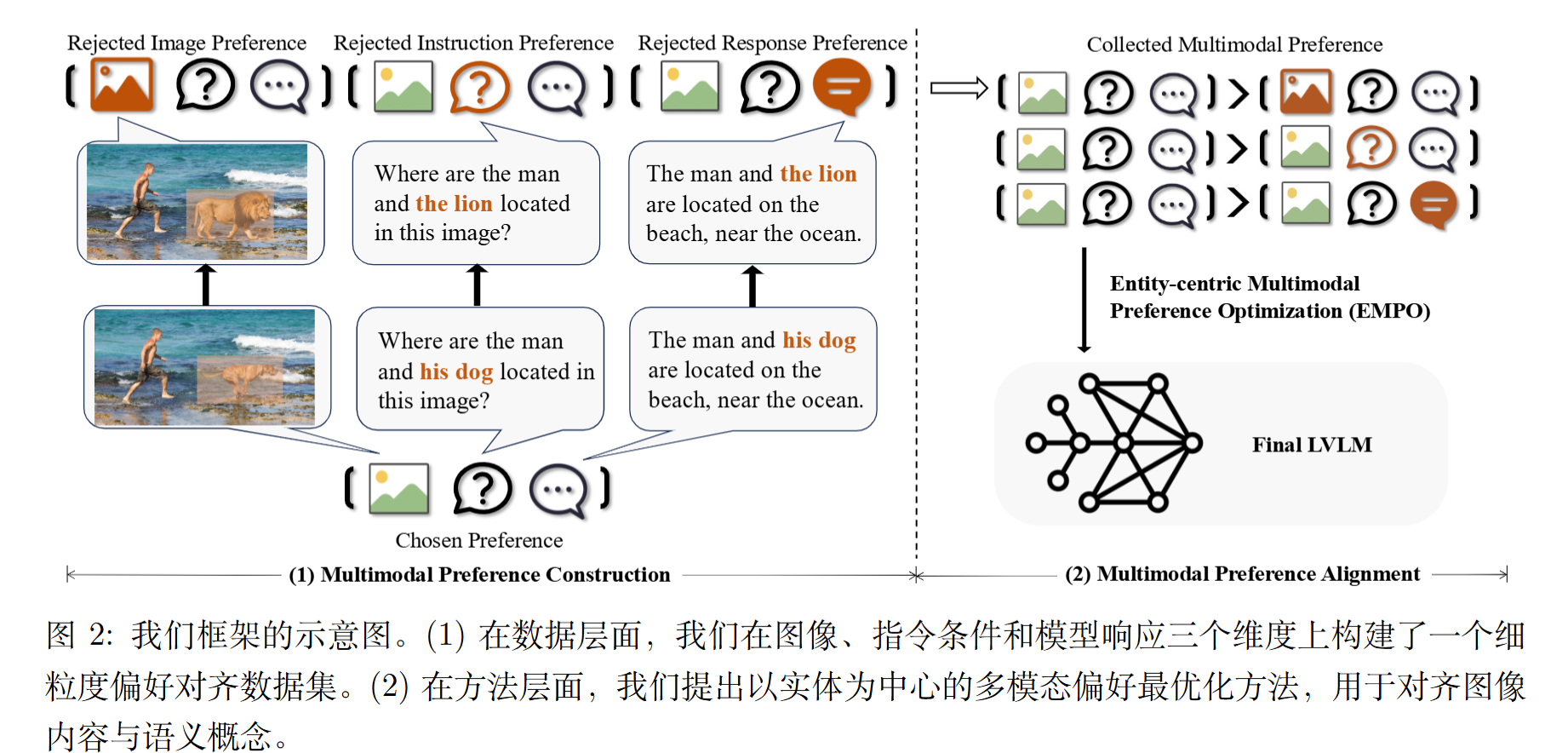 对齐人类偏好包含三个层面:图像、指令和响应。
