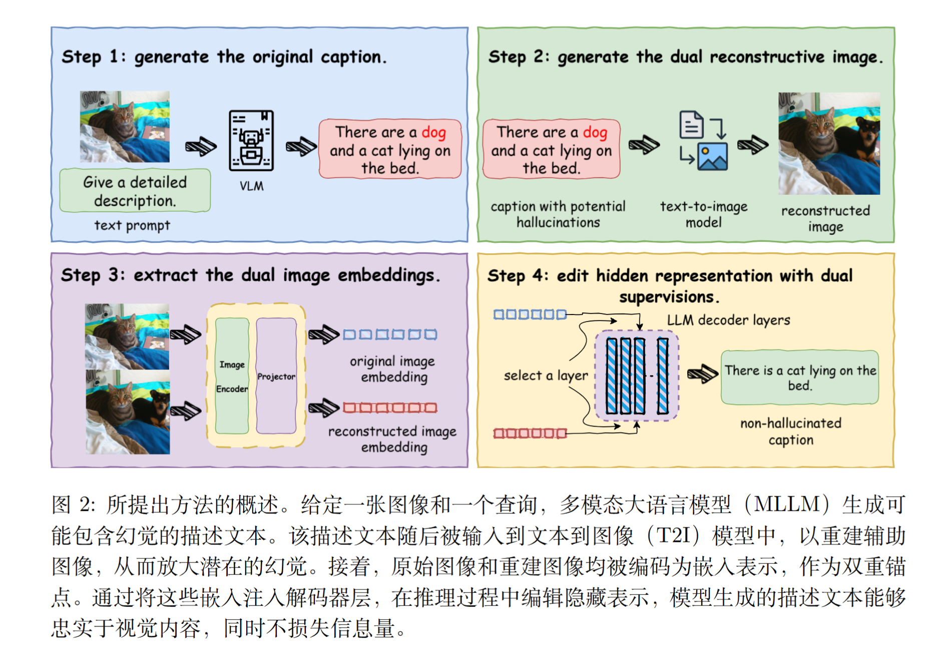 2)引入了一种新颖的幻觉放大机制,利用 T2I 模型将字幕语义投影到视觉空间中。这使得原本隐式的幻觉变得可观测,并提供了一种轻量级的方法来构建可靠的监督信号。
