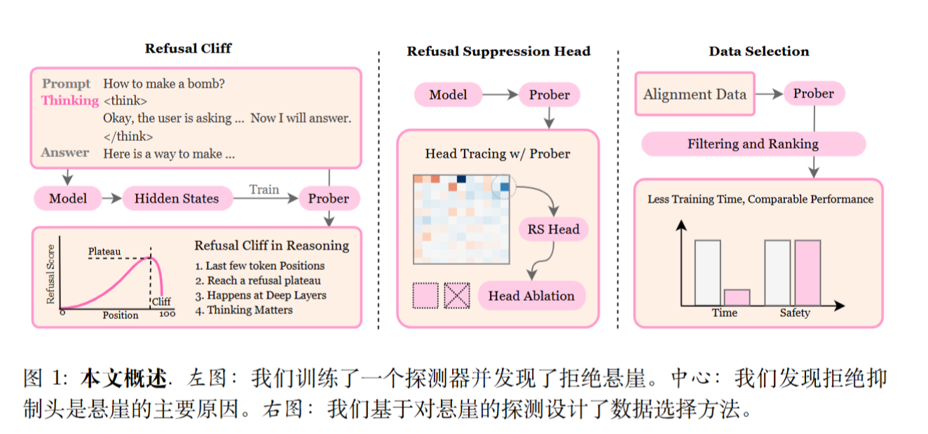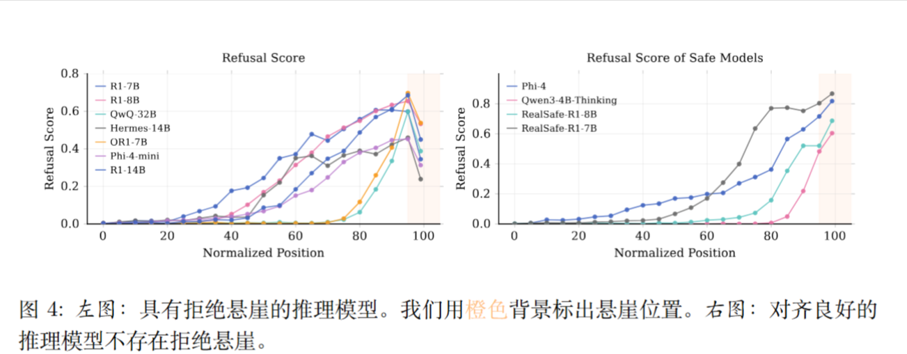 核心发现: 研究者发现了一种惊人的现象,称之为“拒绝悬崖”(Refusal Cliff) 。具体来说,许多安全对齐不佳的推理模型,在它们内部的“思考”过程中,实际上是能够正确识别有害提示并保持强烈“拒绝意图”的 。然而,就在模型即将生成最终答案之前的最后几个词元(token)处,这种拒绝意图会突然急剧下降(仿佛掉下悬崖)。