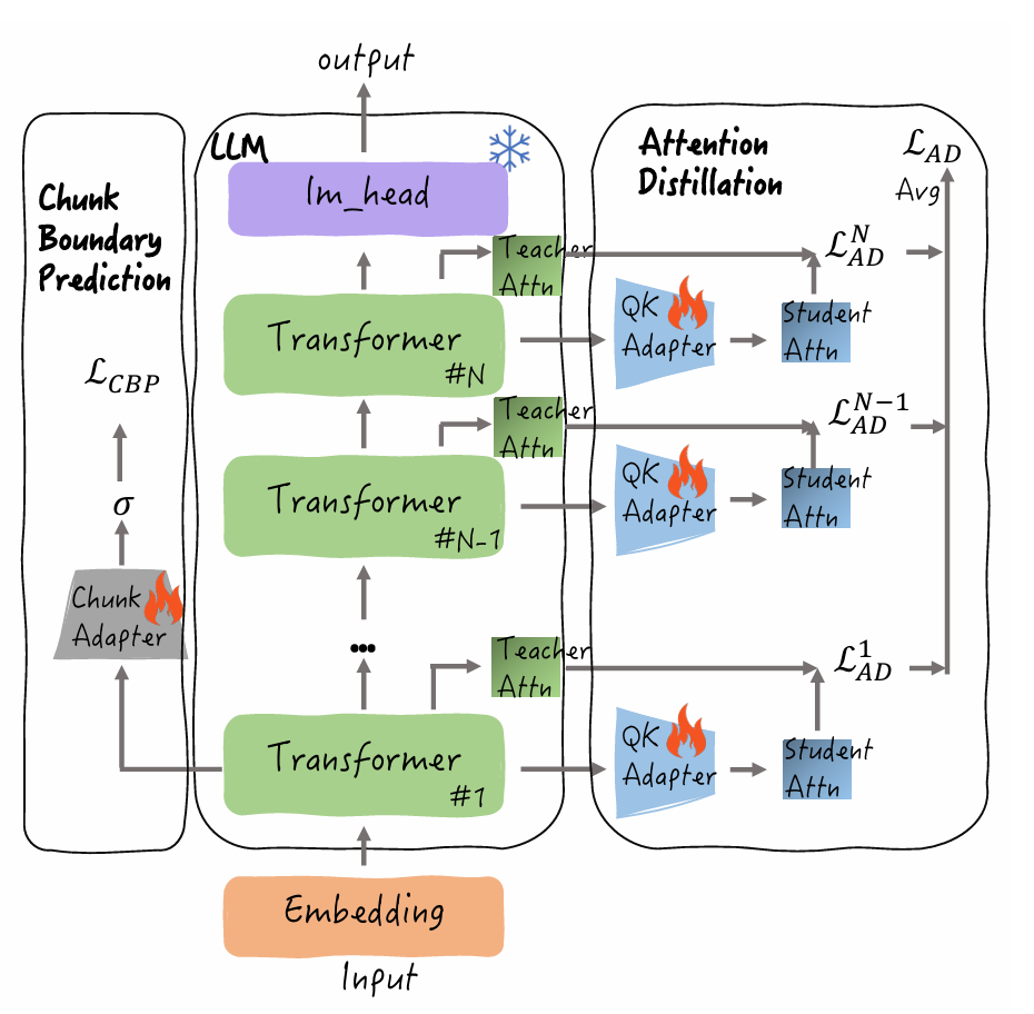 使用知识蒸馏来让”块”级别的注意力分数尽可能接近于原始LLM的完整注意力分数。