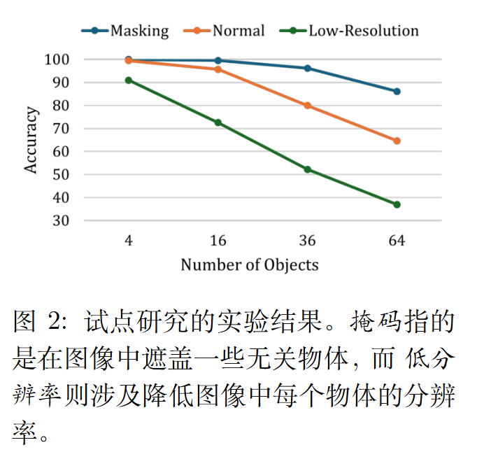 (2) 降低图像中物体的分辨率,以评估它们对模型性能的影响。